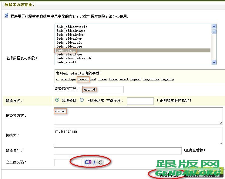 图4:DedeCMS后台菜单“数据库内容替换”然后,进入数据库内容替换操作界面,图5: