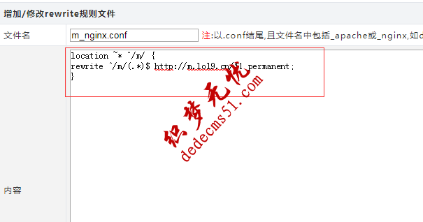 rewrite ^/m/(.*)$ http://m.dedecms51.com/$1 permanent;