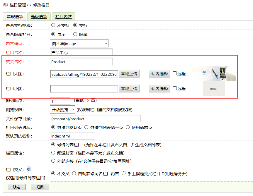 //添加英文名称栏目大图栏目小图