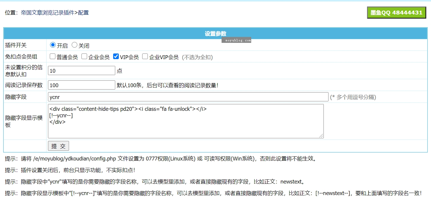 插件功能:帝国CMS扣点阅读显示隐藏内容,支持模型任意设置的字段隐藏,支持主副表字段。自动提醒扣点,自动引导充值!后台可批量设置信息的阅读扣点数,也可以不设置使用统一默认点数。可以设置某些会员组不扣点,可以查看统计阅读者记录,阅读过的信息,会员重复阅读已经阅读过的信息,无需重复提示扣点!