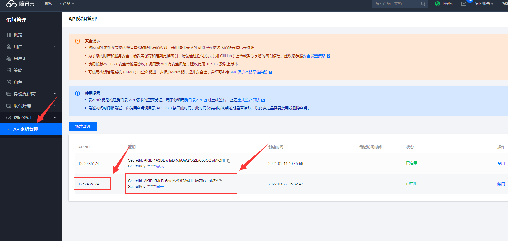 5. 在API密钥管理中点击新建密钥,密钥会自动生成。把APPID 、SecretId 、SecretKey 都复制记录下来