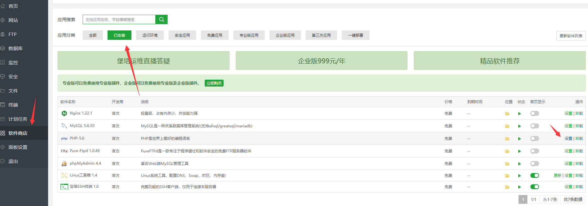 步骤1 在宝塔面板 软件商店-->已安装--php(根据你的站点php版本选择) -->设置