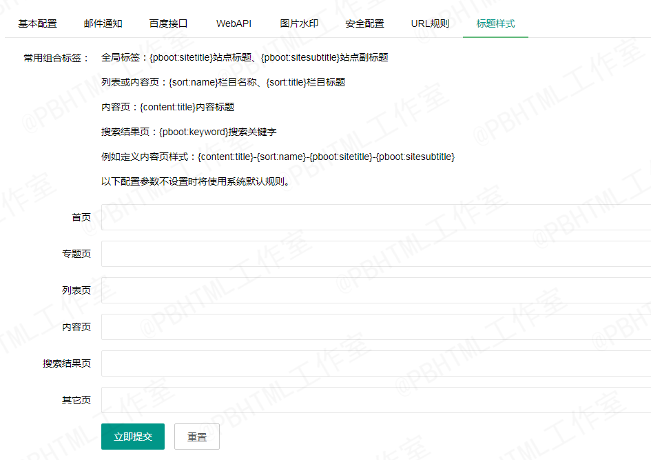 pbootcms2.0.9版针对SEO对个性化标题的需求,增加了标题自定义功能,具体位置在全局配置-配置参数-标题样式,可以任意组合,官方介绍的常用组合:...