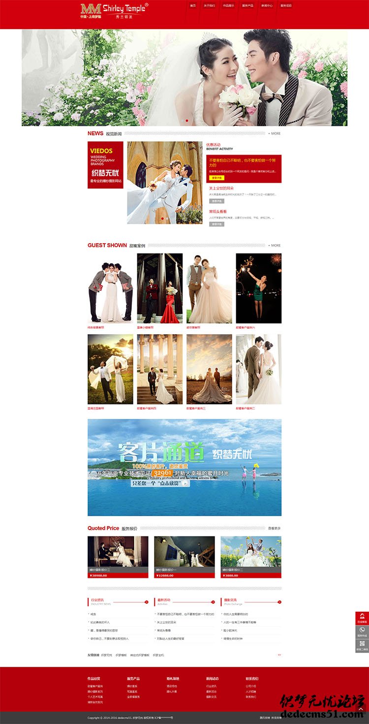 织梦无忧最新内核开发的模板,该模板属于HTML5响应式、摄影设计、婚纱拍摄摄影类企业使用,采用喜庆的大红色设计风格,很适合婚纱摄影类的企业使用,一款适用性很强的模板,基本可以适合各行业的企业网站!