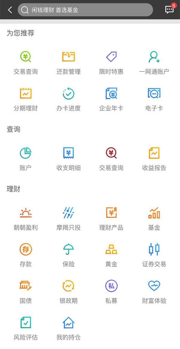 闲钱理财手机APP全部功能列表页面,基金理财服务功能列表手机页面模板下载。结构清晰简单,下载即可使用。