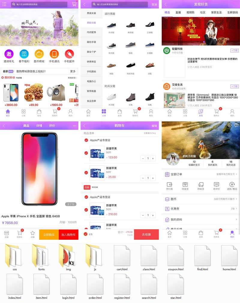 手机weui框架商城模板,一款综合生活类型的手机商城模板html下载。主要有:分类、发现、购物车、我的主页、商品详情、我的优惠券、我的收藏等总共12个手机页面。...