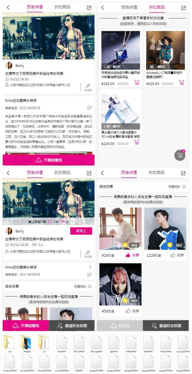 html5 手机页面商城, 视频直播类商城,介绍商品页面,折扣商城。内含:报名页面,预告详情,折扣商品,验证手机 ,投票规则,报名成功 ,报名信息等总共19个app页面模板下载。...