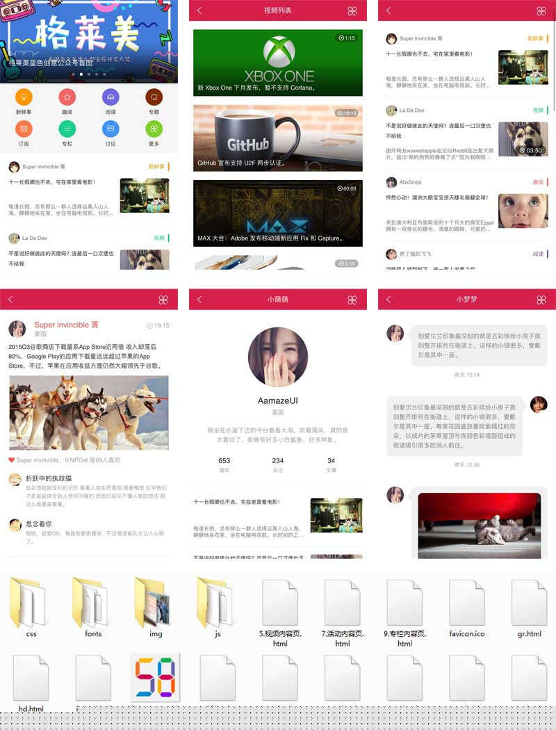 红色的新闻资讯博客类型手机模板,新闻app网站模板html源码下载,包含了所有的页面。以及js交互。主要页面有:内容列表页、视频列表页、活动列表页、专题列表页、私信内容页、个人中心、空间动态列表页等总共13个页面。...