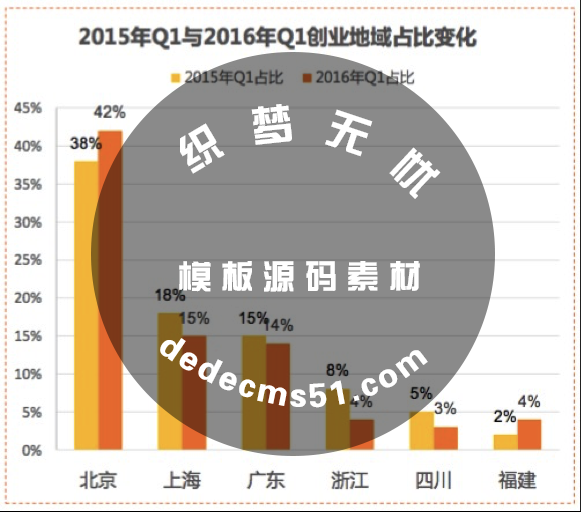 如上图所示,2016年Q1国内新成立公司创业方向分布中,电子商务占15%、文化娱乐占13%、企业服务占12%、社交网络占10%、教育类创业项目占8%。2016年Q1与2015年Q1部分行业创业比重也发生了变化,2016年Q1文化娱乐、企业服务、教育和社交的创业比重都有大幅增长;而本地生活与金融这两大去年的热门则经历了显著下滑。国内创业态势已经与去年有方向性转变。